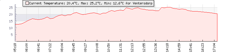 | GPS Co-ordinates: | S 26º 22' 36, E 26º 46' 06 | | ASL: | 5000 feet | | Sunrise / Sunset: | 05:20 / 18:34 | | Beaufort Scale: | Gentle Breeze |