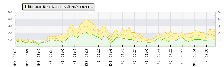In the last few minutes the wind was North North East at an average speed of 14 kmh, reaching up to 19 kmh and a low of 8 kmh. The gust strength is11 kmh above the minimum speed |
