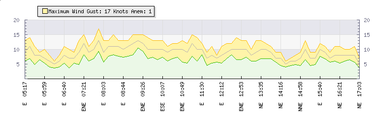 In the last few minutes the wind was North Easterly at an average speed of 7 knots, reaching up to 9 knots and a low of 5 knots. The gust strength is4 knots above the minimum speed |