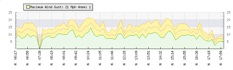 In the last few minutes the wind was Northerly at an average speed of 10 mph, reaching up to 13 mph and a low of 6 mph. The gust strength is7 mph above the minimum speed |