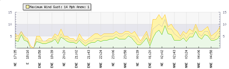 In the last few minutes the wind was Northerly at an average speed of 9 mph, reaching up to 10 mph and a low of 7 mph. The gust strength is3 mph above the minimum speed |