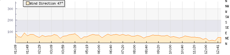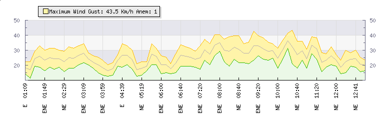 In the last few minutes the wind was East North East at an average speed of 30 kmh, reaching up to 37 kmh and a low of 24 kmh. The gust strength is13 kmh above the minimum speed |