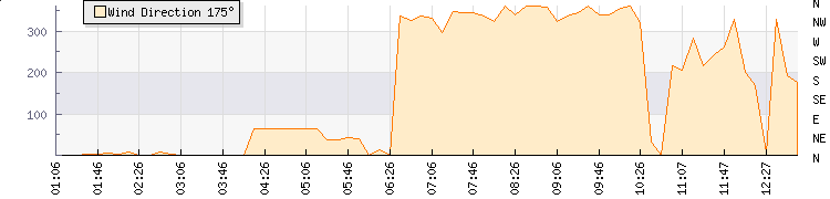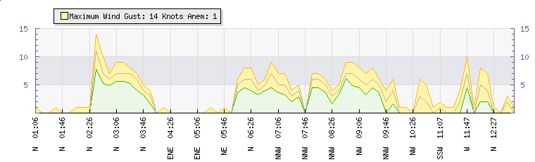 In the last few minutes the wind was South Westerly at an average speed of 1 knots, reaching up to 1 knots and a low of 0 knots. The gust strength is1 knots above the minimum speed |