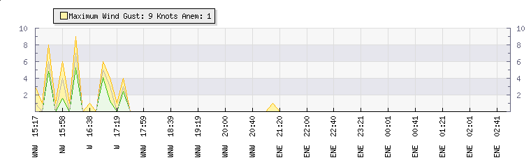 In the last few minutes the wind was East North East at an average speed of 0 knots, reaching up to 0 knots and a low of 0 knots. The gust strength is0 knots above the minimum speed |