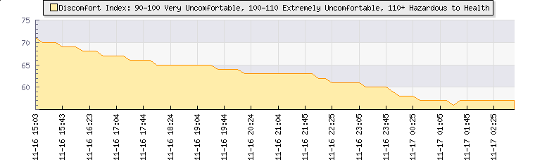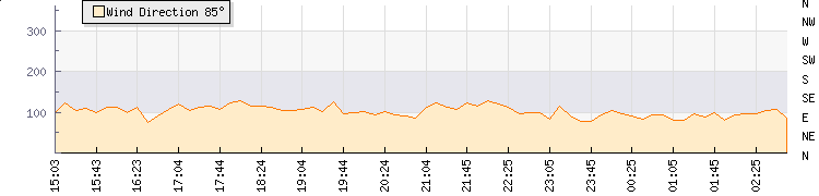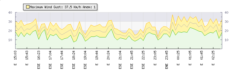 In the last few minutes the wind was Easterly at an average speed of 27 kmh, reaching up to 36 kmh and a low of 19 kmh. The gust strength is17 kmh above the minimum speed |