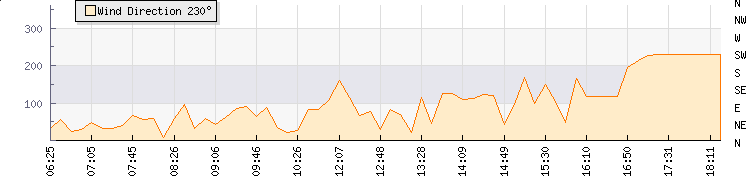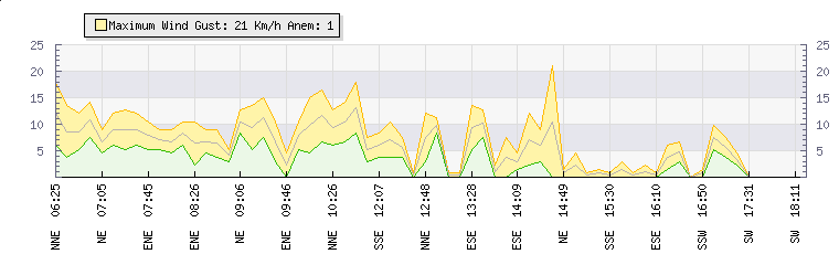 In the last few minutes the wind was East South East at an average speed of 5 kmh, reaching up to 7 kmh and a low of 3 kmh. The gust strength is4 kmh above the minimum speed |