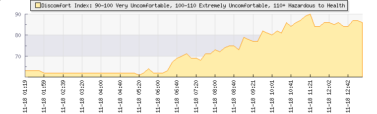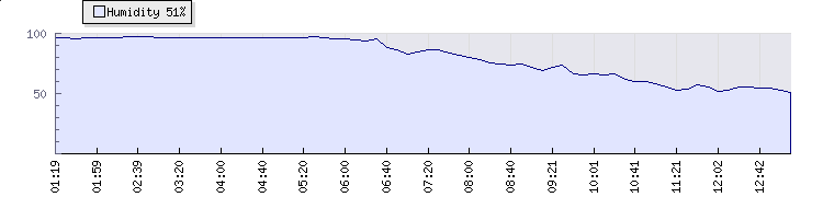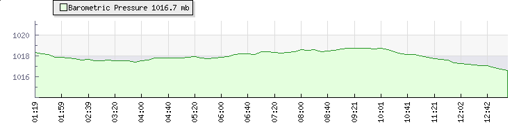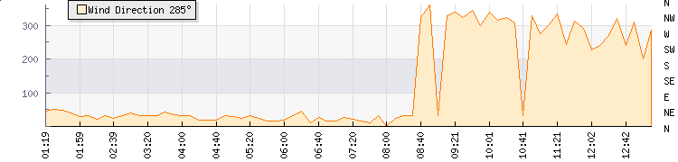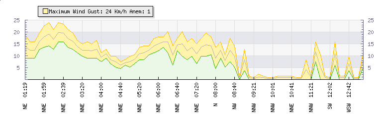 In the last few minutes the wind was North Westerly at an average speed of 5 kmh, reaching up to 11 kmh and a low of 0 kmh. The gust strength is11 kmh above the minimum speed |