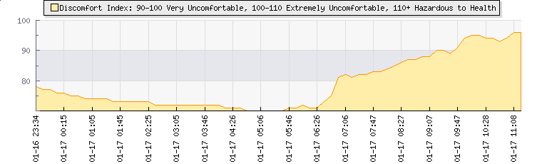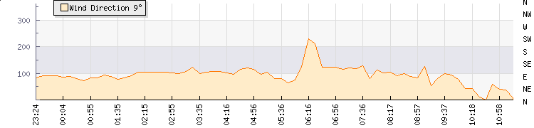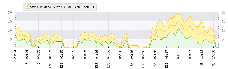 In the last few minutes the wind was Easterly at an average speed of 12 kmh, reaching up to 18 kmh and a low of 7 kmh. The gust strength is11 kmh above the minimum speed |