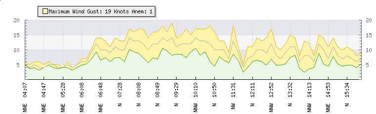 In the last few minutes the wind was North North East at an average speed of 5 knots, reaching up to 5 knots and a low of 4 knots. The gust strength is1 knots above the minimum speed |