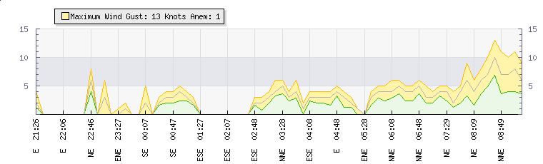 In the last few minutes the wind was East North East at an average speed of 4 knots, reaching up to 5 knots and a low of 2 knots. The gust strength is3 knots above the minimum speed |