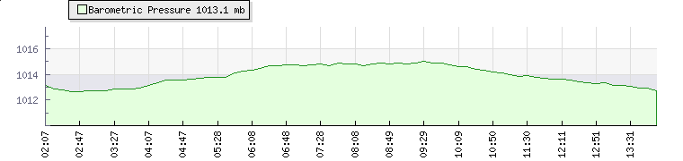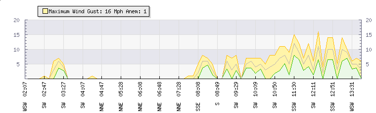 In the last few minutes the wind was South Westerly at an average speed of 4 mph, reaching up to 7 mph and a low of 2 mph. The gust strength is5 mph above the minimum speed |