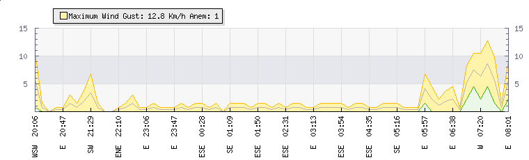 In the last few minutes the wind was Easterly at an average speed of 2 kmh, reaching up to 5 kmh and a low of 0 kmh. The gust strength is5 kmh above the minimum speed |