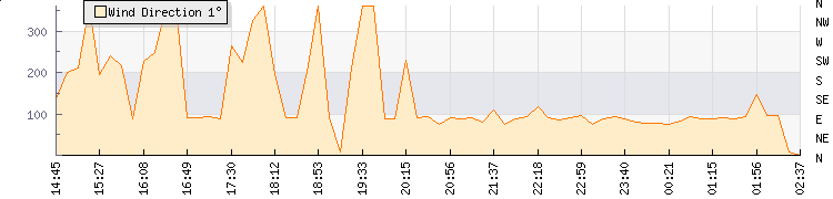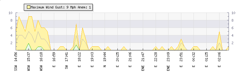 In the last few minutes the wind was Easterly at an average speed of 1 mph, reaching up to 1 mph and a low of 0 mph. The gust strength is1 mph above the minimum speed |