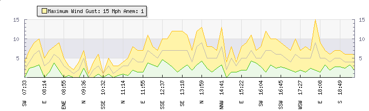 In the last few minutes the wind was Easterly at an average speed of 5 mph, reaching up to 9 mph and a low of 1 mph. The gust strength is8 mph above the minimum speed |