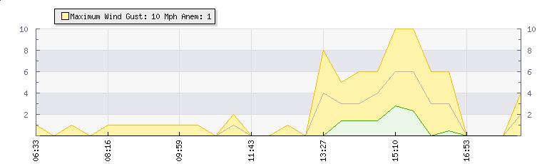 In the last few minutes the wind was blowing at an average speed of 6 mph, reaching up to 10 mph and a low of 3 mph. The gust strength is7 mph above the minimum speed |