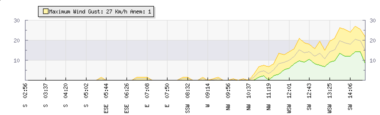 In the last few minutes the wind was East North East at an average speed of 0 kmh, reaching up to 0 kmh and a low of 0 kmh. The gust strength is0 kmh above the minimum speed |