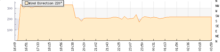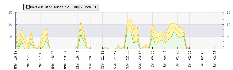 In the last few minutes the wind was South Westerly at an average speed of 0 kmh, reaching up to 0 kmh and a low of 0 kmh. The gust strength is0 kmh above the minimum speed |