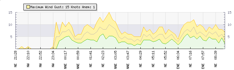 In the last few minutes the wind was East North East at an average speed of 5 knots, reaching up to 7 knots and a low of 3 knots. The gust strength is4 knots above the minimum speed |