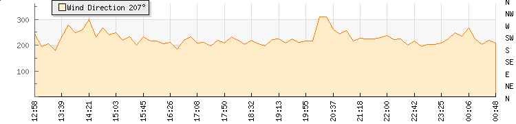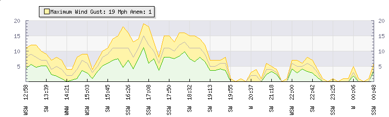 In the last few minutes the wind was South South West at an average speed of 6 mph, reaching up to 8 mph and a low of 3 mph. The gust strength is5 mph above the minimum speed |
