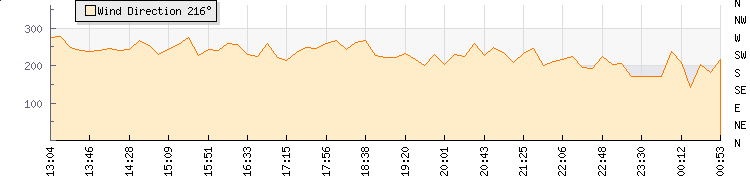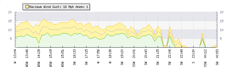 In the last few minutes the wind was South South West at an average speed of 1 mph, reaching up to 1 mph and a low of 0 mph. The gust strength is1 mph above the minimum speed |