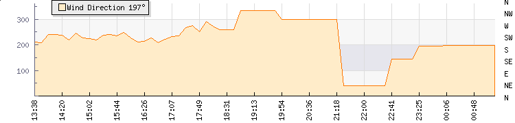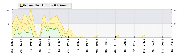 In the last few minutes the wind was South South West at an average speed of 0 mph, reaching up to 0 mph and a low of 0 mph. The gust strength is0 mph above the minimum speed |