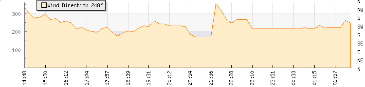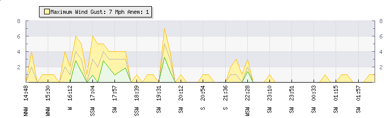 In the last few minutes the wind was South Westerly at an average speed of 0 mph, reaching up to 0 mph and a low of 0 mph. The gust strength is0 mph above the minimum speed |