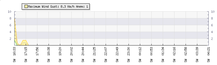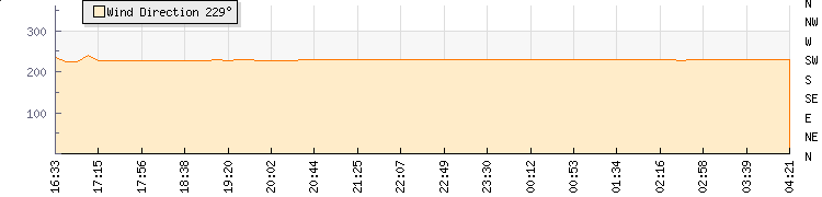 In the last few minutes the wind was South Westerly at an average speed of 0 kmh, reaching up to 0 kmh and a low of 0 kmh. The gust strength is0 kmh above the minimum speed |