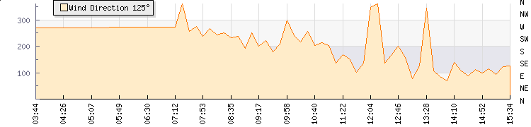 In the last few minutes the wind was South Easterly at an average speed of 1 mph, reaching up to 3 mph and a low of 0 mph. The gust strength is3 mph above the minimum speed |