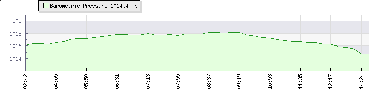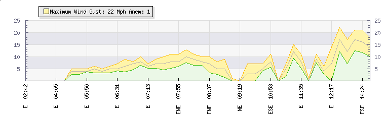 In the last few minutes the wind was East North East at an average speed of 10 mph, reaching up to 13 mph and a low of 7 mph. The gust strength is6 mph above the minimum speed |