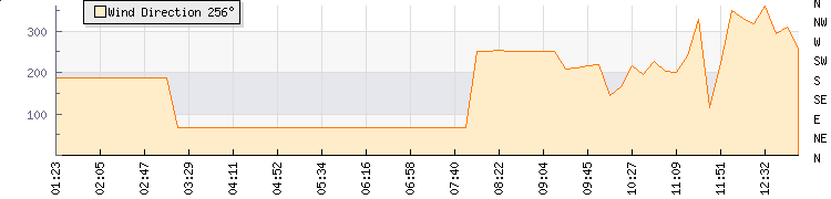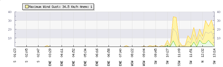 In the last few minutes the wind was South South West at an average speed of 7 kmh, reaching up to 13 kmh and a low of 2 kmh. The gust strength is11 kmh above the minimum speed |