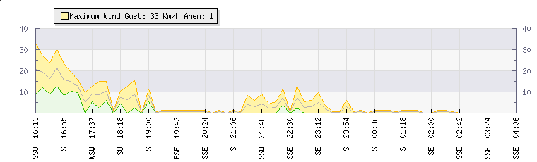 In the last few minutes the wind was South South East at an average speed of 1 kmh, reaching up to 2 kmh and a low of 0 kmh. The gust strength is2 kmh above the minimum speed |
