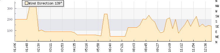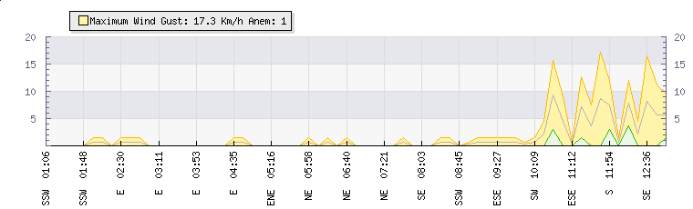 In the last few minutes the wind was South South West at an average speed of 1 kmh, reaching up to 1 kmh and a low of 0 kmh. The gust strength is1 kmh above the minimum speed |