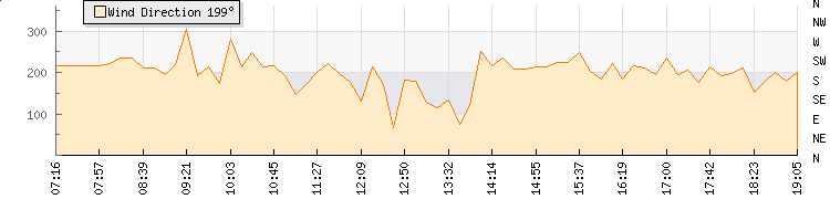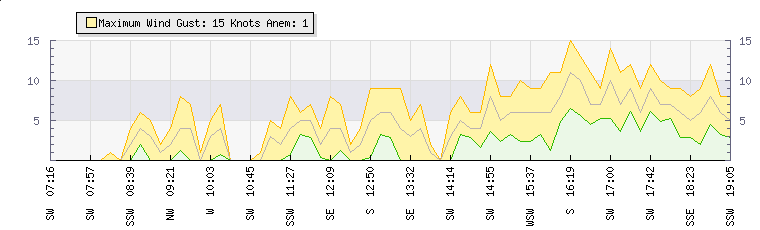 In the last few minutes the wind was Southerly at an average speed of 6 knots, reaching up to 9 knots and a low of 4 knots. The gust strength is5 knots above the minimum speed |
