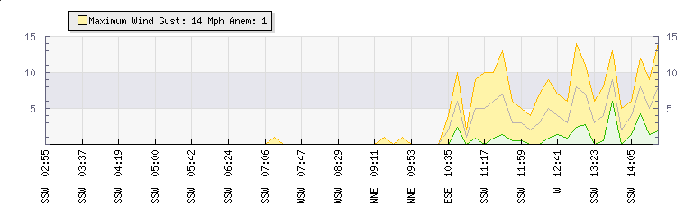 In the last few minutes the wind was South Westerly at an average speed of 7 mph, reaching up to 11 mph and a low of 3 mph. The gust strength is8 mph above the minimum speed |
