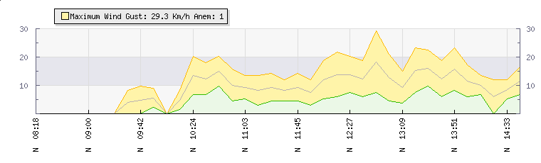 In the last few minutes the wind was Northerly at an average speed of 9 kmh, reaching up to 15 kmh and a low of 4 kmh. The gust strength is11 kmh above the minimum speed |