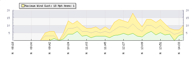 In the last few minutes the wind was Northerly at an average speed of 10 mph, reaching up to 14 mph and a low of 5 mph. The gust strength is9 mph above the minimum speed |