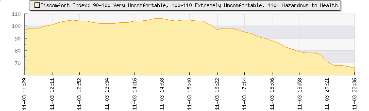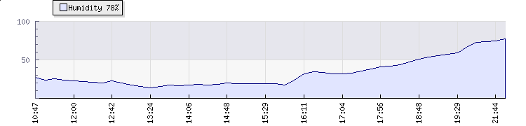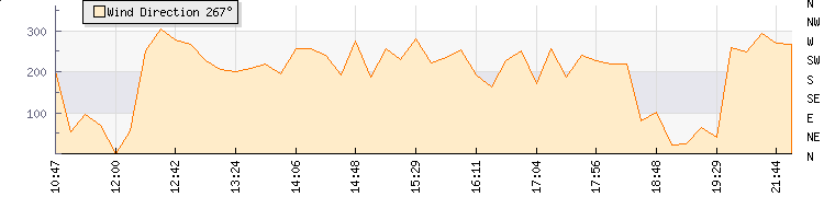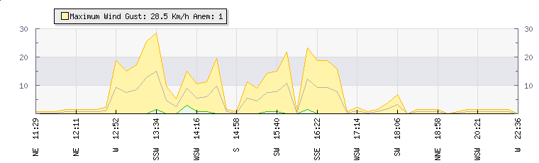 In the last few minutes the wind was West South West at an average speed of 6 kmh, reaching up to 11 kmh and a low of 0 kmh. The gust strength is11 kmh above the minimum speed |