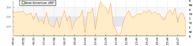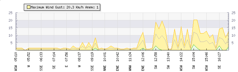 In the last few minutes the wind was South South East at an average speed of 6 kmh, reaching up to 11 kmh and a low of 0 kmh. The gust strength is11 kmh above the minimum speed |