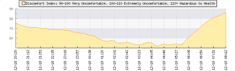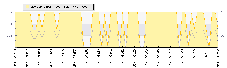 In the last few minutes the wind was Westerly at an average speed of 1 kmh, reaching up to 2 kmh and a low of 0 kmh. The gust strength is2 kmh above the minimum speed |