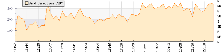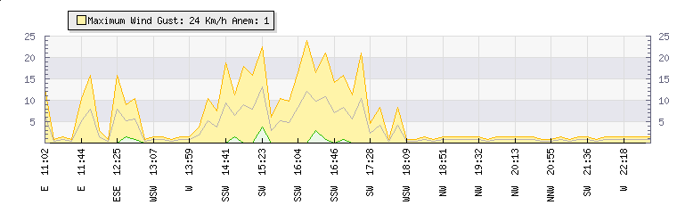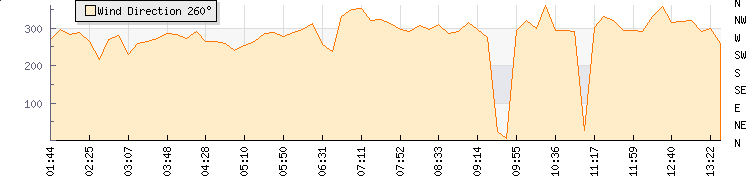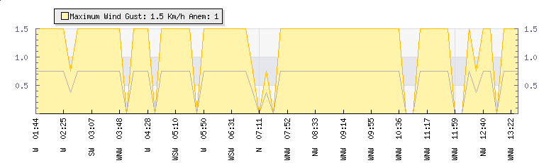 In the last few minutes the wind was West North West at an average speed of 1 kmh, reaching up to 2 kmh and a low of 0 kmh. The gust strength is2 kmh above the minimum speed |