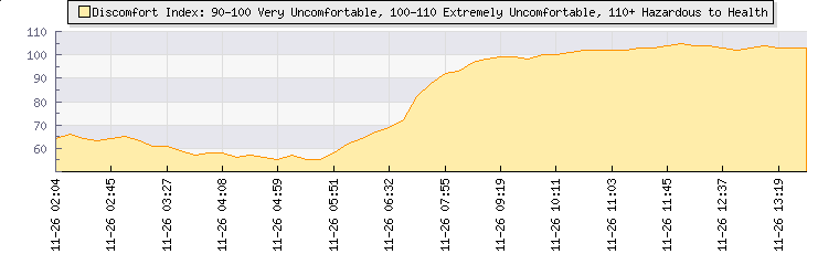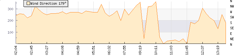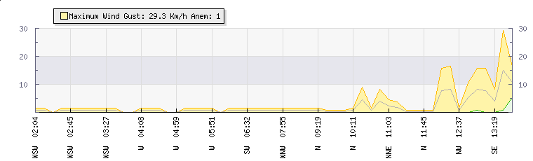 In the last few minutes the wind was West South West at an average speed of 15 kmh, reaching up to 29 kmh and a low of 1 kmh. The gust strength is28 kmh above the minimum speed |