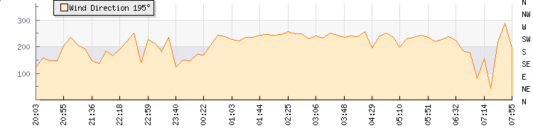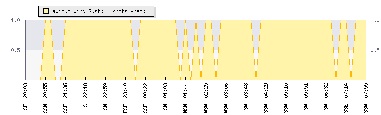 In the last few minutes the wind was West South West at an average speed of 1 knots, reaching up to 1 knots and a low of 0 knots. The gust strength is1 knots above the minimum speed |