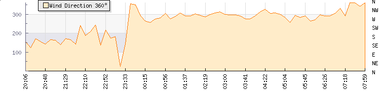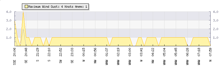 In the last few minutes the wind was Westerly at an average speed of 1 knots, reaching up to 1 knots and a low of 0 knots. The gust strength is1 knots above the minimum speed |