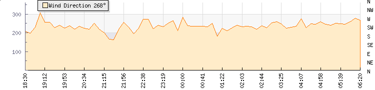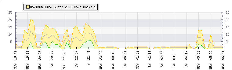 In the last few minutes the wind was West South West at an average speed of 1 kmh, reaching up to 2 kmh and a low of 0 kmh. The gust strength is2 kmh above the minimum speed |