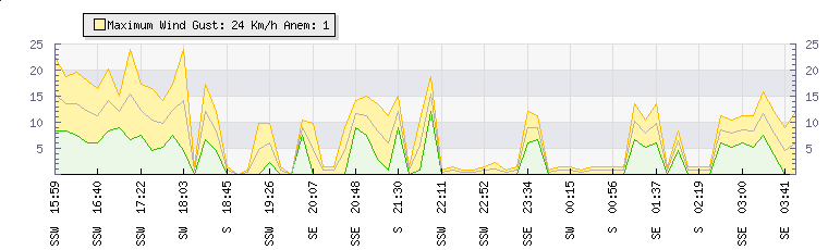 In the last few minutes the wind was South Easterly at an average speed of 1 kmh, reaching up to 2 kmh and a low of 0 kmh. The gust strength is2 kmh above the minimum speed |