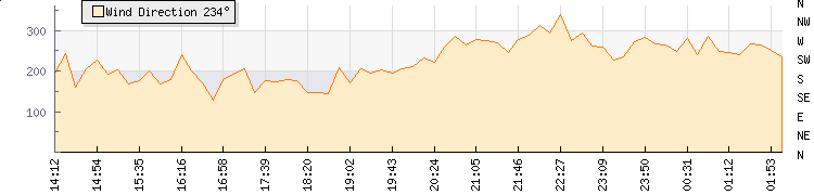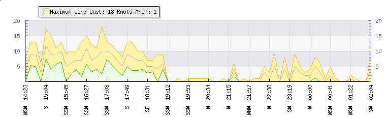 In the last few minutes the wind was West South West at an average speed of 3 knots, reaching up to 6 knots and a low of 0 knots. The gust strength is6 knots above the minimum speed |