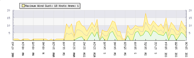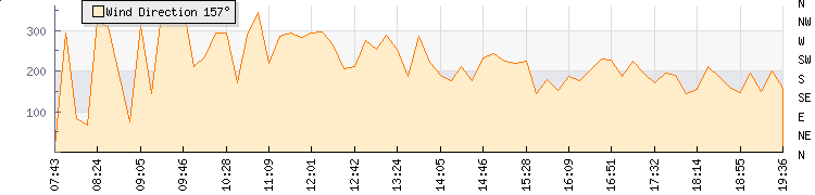 In the last few minutes the wind was South South West at an average speed of 6 knots, reaching up to 9 knots and a low of 4 knots. The gust strength is5 knots above the minimum speed |