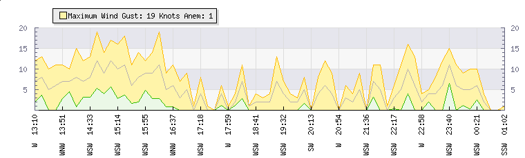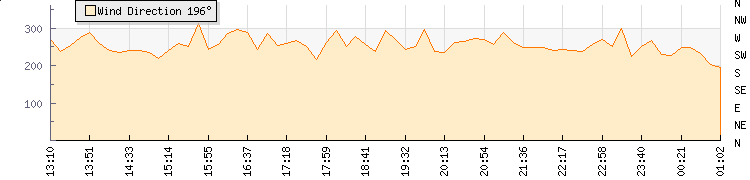 In the last few minutes the wind was South Westerly at an average speed of 5 knots, reaching up to 9 knots and a low of 1 knots. The gust strength is8 knots above the minimum speed |