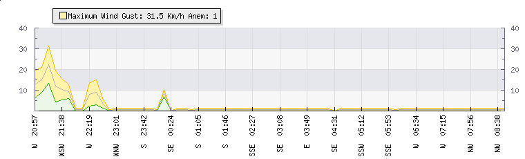 In the last few minutes the wind was South South West at an average speed of 1 kmh, reaching up to 2 kmh and a low of 0 kmh. The gust strength is2 kmh above the minimum speed |
