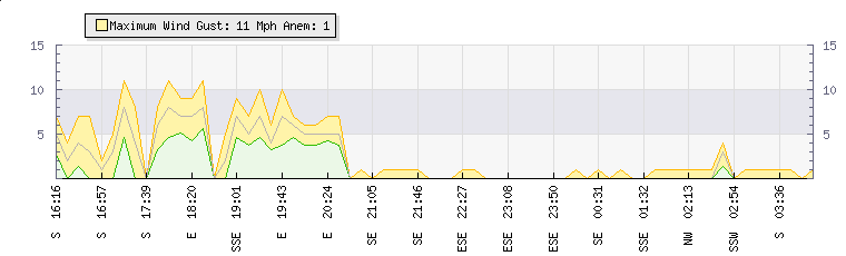 In the last few minutes the wind was South Easterly at an average speed of 1 mph, reaching up to 1 mph and a low of 0 mph. The gust strength is1 mph above the minimum speed |